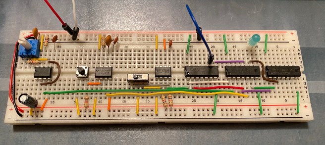 The first box contains the parts needed to create the clock, along with a 5V/2A power supply. The clock is comprised of three NE555 ICs configured in Astable (oscillator), Monostable (timer) and Bistable (latch) modes. Essentially, Ben creates a speed-controllable clock (using a potentiometer), with a manual step mode controlled by a switch. The manual step became essential when debugging issues with data movement later.