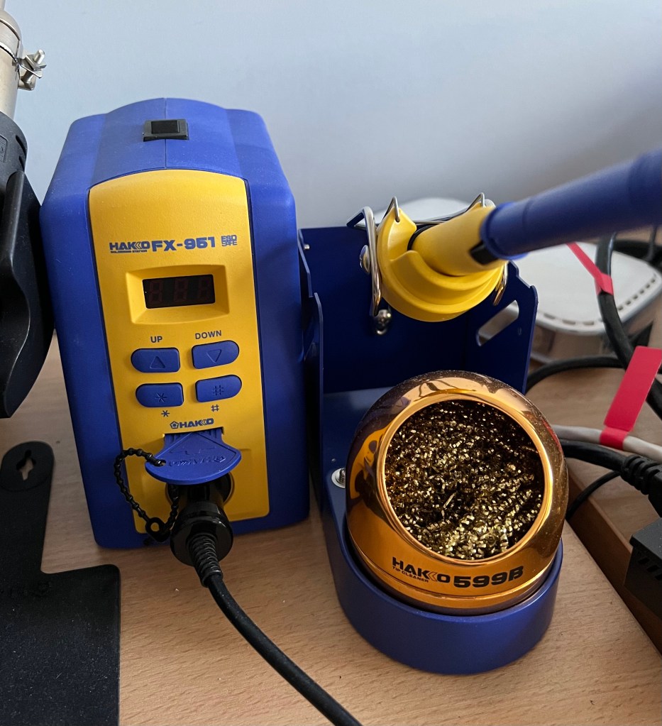 I needed a good soldering iron, as my initial one wasn’t great. I ended up buying an expensive one – a Hakko FX-951 with extra tips. I think I paid around £340. My most expensive gadget, but it is brilliant. I have since also bought the micro-soldering attachment. By the way, the circuit board holding in the picture is perfect.