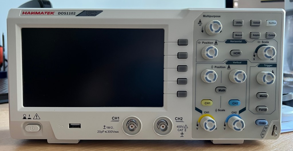 The next purchase was a cheap oscilloscope so that I could visualize what was going on in my circuits. I opted for a Hanmatek DOS1102 for the sale price of £160. I wanted a Rigol, but they were too expensive.